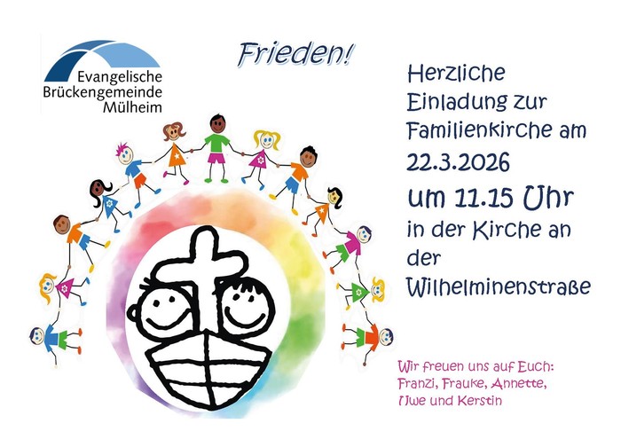 Am Sonntag, 22. März 26 ist es wieder soweit: Familienkirche in der Broicher Kirche zum Thema "Frieden!" mit Singen, Basteln, Spielen und Beten.