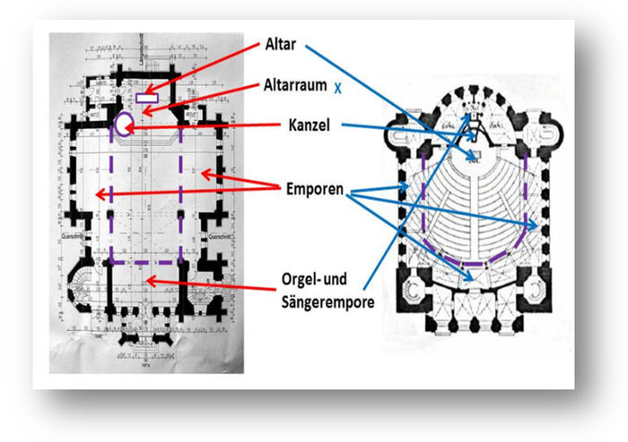 · Eine dreiseitige umlaufende Empore (hatten nur Petrikirche und Saarner Dorfkirche) mit Platz für insgesamt 800 Menschen,