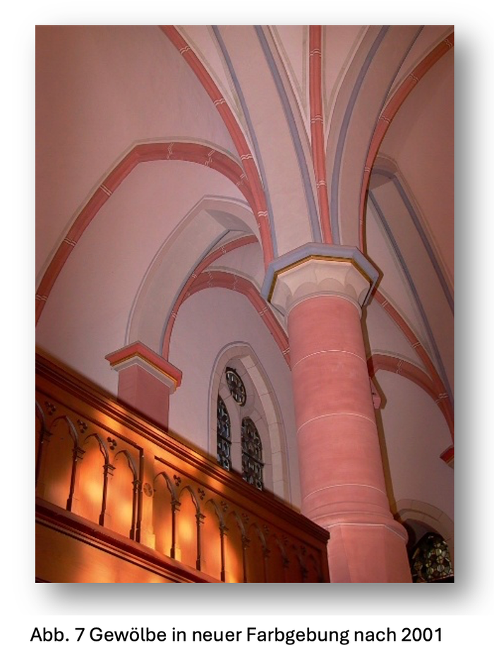 Kurze Zeit später stand der Innenraum an: Von Anfang an war die Farbigkeit ein Problem. Die Dunkelheit des Innenraums versuchte man zuerst durch die Verwendung weißer Farbe für das Deckengewölbe und die Wandflächen aufzuhellen. Diesen kühlen Farbton hatte der Kirchen- und Glasmaler Karl Helwig lindgrün übermalen wollen. So kam es 2000 / 2001 zur Verwendung warmer Farbtöne und farblicher Hervorhebung der Gewölberippen. Für die Pfeiler, auf denen das Deckengewölbe ruht, wurde ein roter Farbton gewählt, angedeutete Fugen erinnern an Buntsandsteinquader. Die Verwendung von Blattgold verleiht dem Kirchenraum einen festlichen Charakter.