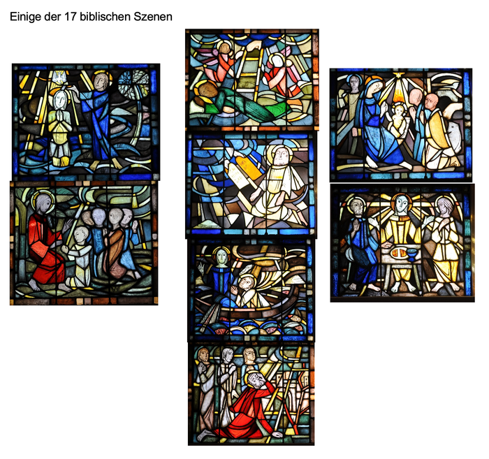 Noch einen Blick zurück auf die Jahre 1933 bis 1944 – bis zur Nacht vom 1. auf den 2. November, als ein versprengter Bomber eine Luftmine auf die benachbarte Lederfabrik entlud und mindestens fünf Menschen, das Künstleratelier von Willi Deus und die bunten Fenster unserer Kirche vernichtete. Das Chorfenster zeigte die Himmelfahrt Christi, die großen Fensterflächen über den Emporen des Querschiffs zeigten die Taufe Jesu durch Johannes und Jesus mit Maria Magdalena und Martha. Die zerstörten Fenster wurden von Fabrikanten, vom Frauenverein und vom Evangelischen Arbeiterverein gestiftet. Zu letzterem sei angemerkt, dass der Verein nach Wikipedia als „strikt antikatholisch und antisozialdemokratisch ausgerichtet“ war.