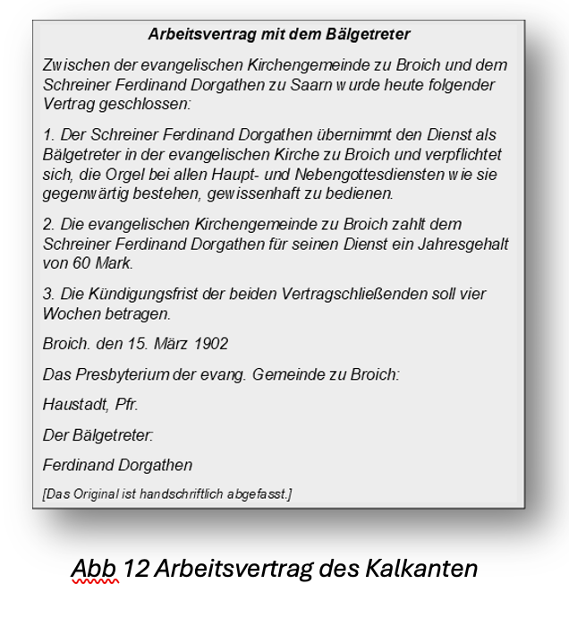 Mit dem Schreiner Ferdinand Dorgathen aus Saarn schloss Pfarrer Haustadt am 15. März 1902 einen Arbeitsvertrag. Seitdem war er Bälgetreter der Broicher Gemeinde im Nebenerwerb, denn sonntags hatte er ja Zeit. (Original des Vertrags im Kirchenarchiv) Überall hatte es Kalkanten gegeben, die ihre Wadenmuskeln in den Dienst der Kirchenmusik stellten. In Landgemeinden mit kleineren Orgeln versahen diesen Dienst oft die Konfirmanden.