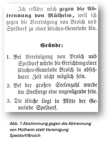 Alle Orte innerhalb der preußischen Bürgermeisterei Mülheim an der Ruhr gehörten kirchlich zur reformierten Petrikirche, zur lutherischen Paulikirche oder zur katholischen Marienkirche. Ausgenommen hiervon war Saarn, wo die evangelischen Gemeindeglieder nach jahrzehntelangem Konflikt 1844 unabhängig wurden. Wir bleiben in dieser Abhandlung bei der Bürgermeisterei Broich, die 1890 mehr als 13.000 Einwohner hatte, davon entfiel der größte Teil auf die Gemeinde Broich, die am stärksten von der Industrie geprägt war: Zu nennen sind hier vor allem die Lederindustrie und das Eisenbahnausbesserungswerk, während Saarn und Speldorf noch deutlicher landwirtschaftlich geprägt waren. Die (größere) Petrigemeinde als Muttergemeinde bereitete die Loslösung der Bezirke Broich/Speldorf, Styrum/Dümpten und Heißen/mit Bauernschaften vor, indem sie 1883 jeweils eine Filialkirche in den neuen Bürgermeistereien errichten ließ – Standorte waren Speldorf, Styrum und H.