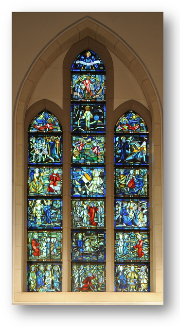 Das Chorfenster lenkt die Blicke der Kirchenbesucher und -besucherinnen auf den Chorraum und den Altar. Es wurde von dem Wuppertaler Glasmaler Karl Hellwig (1911-96) als eines seiner frühen Nachkriegswerke 1948/49 geschaffen. Sämtliche Fenster hatten den Krieg nicht überlebt. Mit Unterstützung der Besatzungsmacht erhielt die Kirche 1945/46 eine Notverglasung, damit wieder Gottesdienste gefeiert werden konnten. Anstelle des Chorfensters musste ein Provisorium aus Brettern das durch den Luftdruck einer Bombe entstandene Loch verdecken. Statt einer Notverglasung im Chor kam es zu einer längeren theologisch dominierten Planungsphase, ob über dem Altartisch eine figürliche Wiedergabe biblischer Szenen angebracht sei. Das Ergebnis: Drei Bildreihen erinnern an die Bildtafeln eines mittelalterlichen Flügelaltars, eines Triptychons. Über der herausgehobenen mittleren Bildreihe steht eine Engelfigur mit dem Spruchband „Im Anfang war das Wort“ (Gottes Wort und die Predigt darüber). Die Vertikale an den Seiten zeigen biblische Szenen zum Sakrament der Taufe (links) und des Abendmahls (rechts), die nach evangelischem Verständnis einzigen Sakramente, die auf Worte Jesu begründet sind.