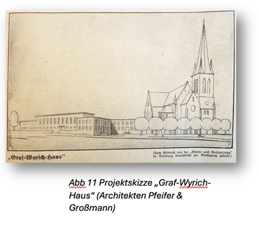 Das Stiftungskapital und die durch Kirchenkonzerte eingespielten Gelder überstanden weder den Ersten Weltkrieg noch die Währungsreform von 1923. Mit der Weimarer Republik schien es erst einmal aufwärtszugehen – also der nächste Anlauf: Im Jahr 1925 wurde der „Bauverein Graf-Wyrich-Haus“ gegründet. An der Ausschreibung des Architekten-Wettbewerb nahmen 56 (!) Architekten teil. Interessant ist die Teilnahme des Architekturbüros Pfeifer & Großmann, das auch das Gemeindezentrum Altenhof auf dem Kirchenhügel plante – nicht zu vergessen das Rathaus und die Stadthalle. Hoffnungsvoll wurde der Spendentopf gefüllt, wöchentliche Kirchenkonzerte durch ehrenamtlich Mitwirkende aus der Gemeinde ließen auf baldige Verwirklichung der Pläne hoffen. Der Börsenkrach von 1929 mit Massenarbeitslosigkeit und die Beseitigung der Demokratie durch das „Dritte Reich“ machten der Planung ein Ende. Für die Hitlerjugend baute die Stadt Mülheim 1940 ein Heim auf der Holzstraße.