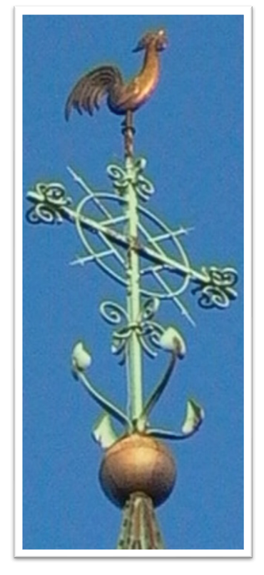 Am Ende dieser Abhandlung sei noch ein Blick auf das Kreuz auf dem Kirchturm gestattet, weil es ziemlich einmalig ist. Die meisten Kirchen begnügen sich mit einem schlichten Kreuz, oft kombiniert mit einem Wetterhahn. In Broich haben wir es mit einer fünffachen Krönung der Spitze zu tun. Auf einer goldenen Kugel, die die Weltkugel symbolisiert, steht das Kreuz als das am weitesten verbreitete Glaubenssymbol. Es findet sich wieder im Grundriss der Kirche und steht auf dem Altar. Der Anker ist ein Symbol der Hoffnung, der Zuversicht und des Heils. Wir erinnern uns auch daran, dass die Ruhrschifffahrt ein wichtiger Wirtschaftszweig in Mülheim war. Im Zentrum des Kreuzes stehen die Marterwerkzeuge Ysoprohr und Lanze, die den Kreuzestod Christi begleiten.