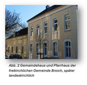Damit war in der Bürgermeisterei Broich ein Konflikt entstanden: Die Hauptfigur spielte hierbei der Bürgermeister von Broich in Gestalt des Hauptmanns a.D. Ludwig Mentz, hinter dem sich die Broicher Unternehmerschaft versammelt hatte. Die kirchlicherseits „von oben“ verfügte Gründung der Doppelgemeinde Broich-Speldorf mit dem Kirchenstandort in Speldorf stieß bei den Broichern – nach einer Abstimmung der Gemeindemitglieder – auf Ablehnung, sodass 500 sogenannte Haushaltsvorstände mit Familienmitgliedern aus der evangelischen Landeskirche austraten und den „Verein Evangelische Gemeinde Broich“ gründeten. Das waren etwa 1.500 Gemeindemitglieder und damit ein Drittel der evangelischen Broicher. Der Kirchsaal und das Pfarrhaus auf der Wilhelminenstraße 7 und 9 waren eine Stiftung von Ferdinand Roßkothen, genauer seiner früh verstorbenen Ehefrau Wilhelmine (Wilhelminenstraße!). Friedrich Habermas, der aus Thüringen stammte, wurde als Pfarrer von der freikirchlichen Gemeinde angestellt.